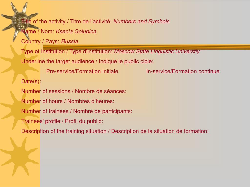 Title of the activity / Titre de l’activité: Numbers and Symbols Name / Nom: Ksenia Golubina Country / Pays: Russia Type of Institution / Type d’institution: Moscow State Linguistic Universtiy Underline the target audience / Indique le public cible: Pre-service/Formation initiale In-service/Formation continue Date(s): Number of sessions / Nombre de séances: Number of hours / Nombres d’heures: Number of trainees / Nombre de participants: Trainees’ profile / Profil du public: Description of the training situation / Description de la situation de formation: