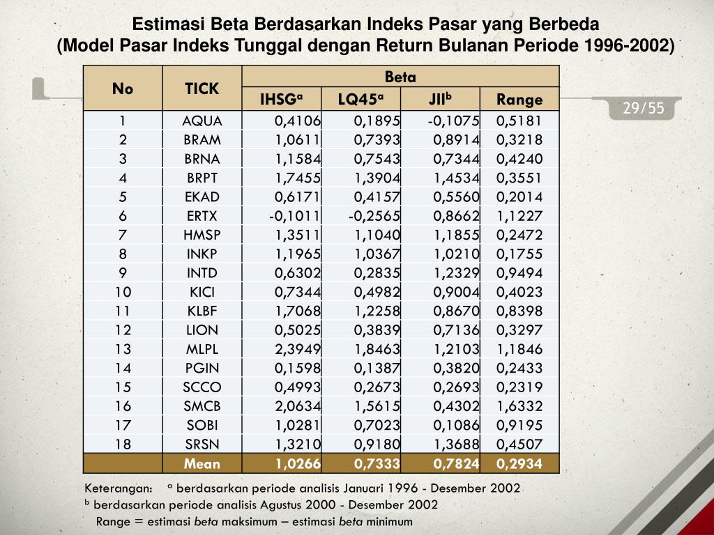 Estimasi Beta Berdasarkan Indeks Pasar yang Berbeda (Model Pasar Indeks Tunggal dengan Return Bulanan Periode 1996-2002) 29/55 Keterangan: a berdasarkan periode analisis Januari 1996 - Desember 2002 b berdasarkan periode analisis Agustus 2000 - Desember 2002 Range = estimasi beta maksimum – estimasi beta minimum