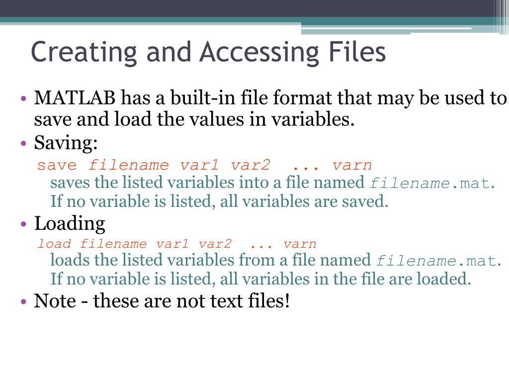 Creating and Accessing Files • MATLAB has a built-in file format that may be used to save and load the values in variables. • Saving: save filenamevar1var2 ... varnsaves the listed variables into a file named filename.mat. If no variable is listed, all variables are saved. • Loading load filename var1 var2 ... varn loads the listed variables from a file named filename.mat. If no variable is listed, all variables in the file are loaded. • Note - these are not text files!