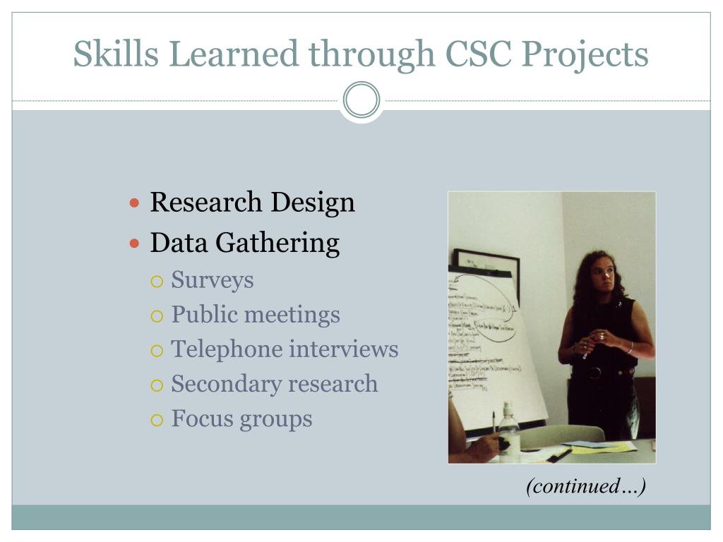 Skills Learned through CSC Projects • Research Design • Data Gathering • Surveys • Public meetings • Telephone interviews • Secondary research • Focus groups (continued…)