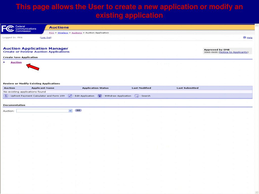 The User is Presented with the Log In screen to Access the Auction Application and Bidding System. Action: Enter FRN and Password. The User is Presented with My Auctions Page. This page allows the User to create a new application or modify an existing application.