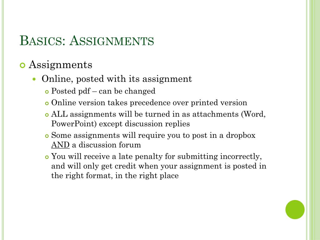 Basics: Assignments • Assignments • Online, posted with its assignment • Posted pdf – can be changed • Online version takes precedence over printed version • ALL assignments will be turned in as attachments (Word, PowerPoint) except discussion replies • Some assignments will require you to post in a dropboxAND a discussion forum • You will receive a late penalty for submitting incorrectly, and will only get credit when your assignment is posted in the right format, in the right place