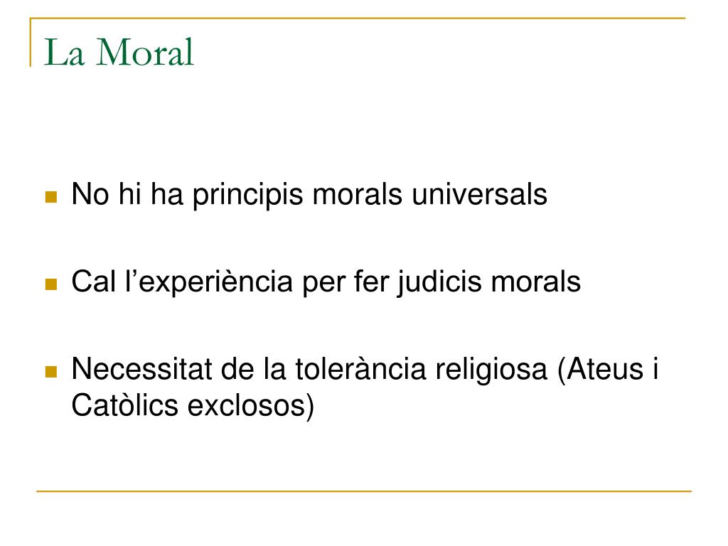 La Moral • No hi ha principis morals universals • Cal l’experiència per fer judicis morals • Necessitat de la tolerància religiosa (Ateus i Catòlics exclosos)