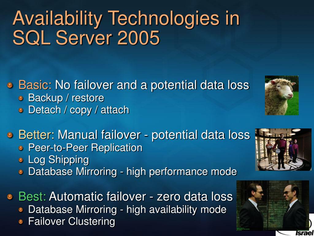 Availability Technologies in SQL Server 2005 • Basic: No failover and a potential data loss • Backup / restore • Detach / copy / attach • Better: Manual failover - potential data loss • Peer-to-Peer Replication • Log Shipping • Database Mirroring - high performance mode • Best: Automatic failover - zero data loss • Database Mirroring - high availability mode • Failover Clustering
