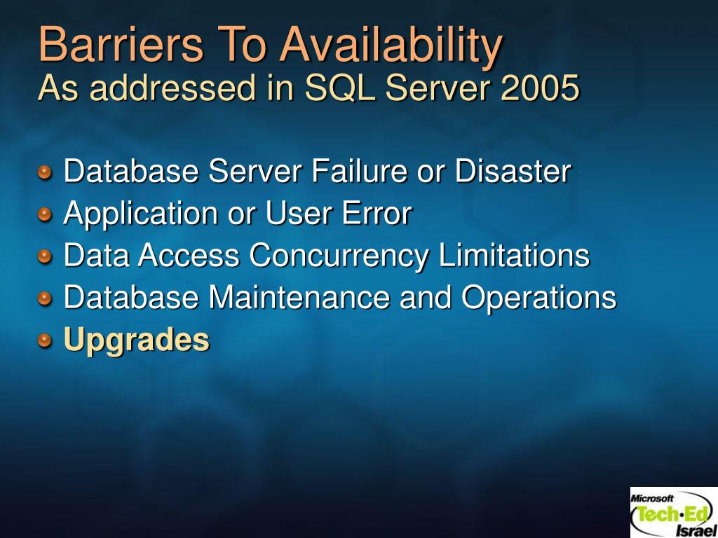 Barriers To AvailabilityAs addressed in SQL Server 2005 • Database Server Failure or Disaster • Application or User Error • Data Access Concurrency Limitations • Database Maintenance and Operations • Upgrades
