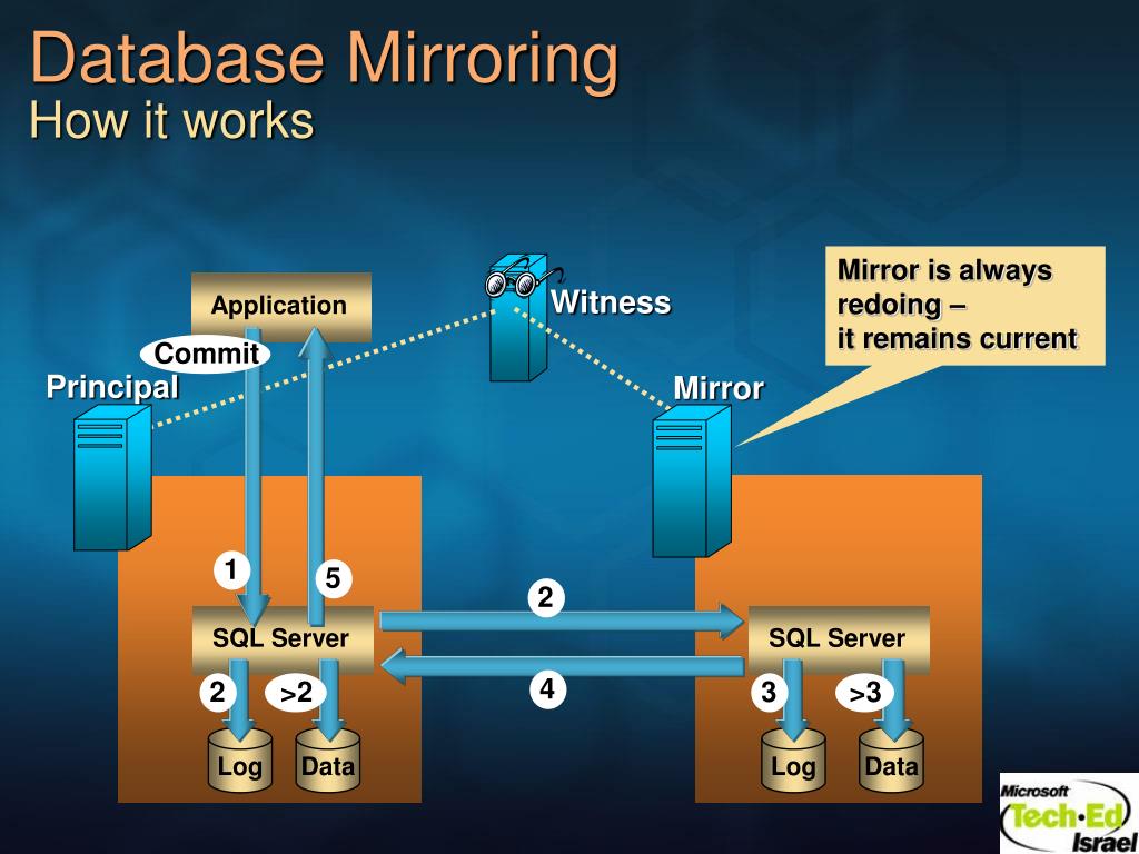 4 >3 >2 3 1 5 2 2 Commit Application SQL Server SQL Server Database Mirroring How it works Mirror is always redoing – it remains current Witness Principal Mirror Log Data Log Data