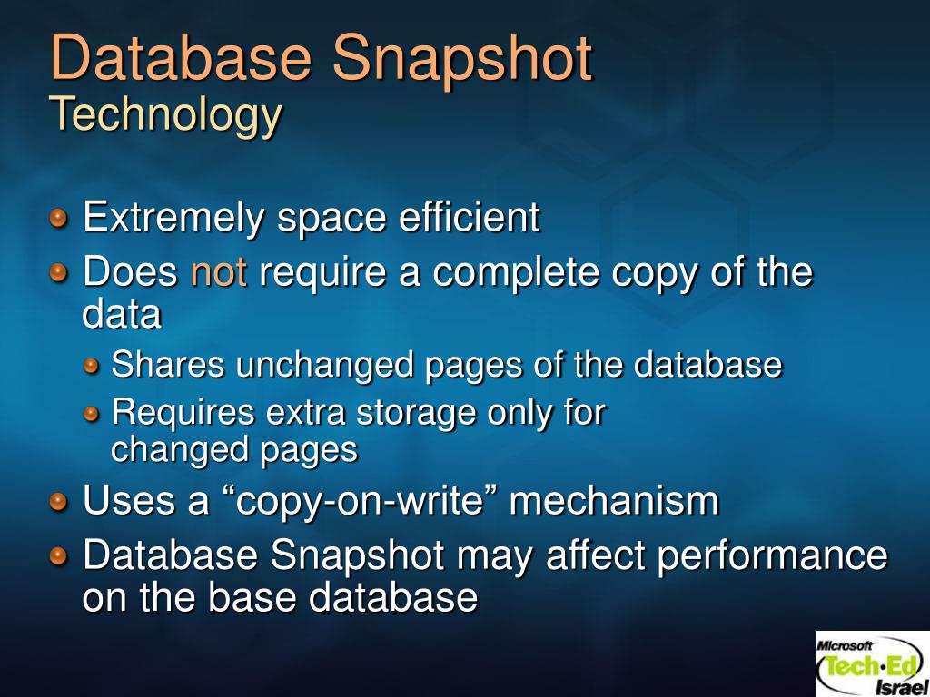 Database SnapshotTechnology • Extremely space efficient • Does not require a complete copy of the data • Shares unchanged pages of the database • Requires extra storage only for changed pages • Uses a “copy-on-write” mechanism • Database Snapshot may affect performance on the base database