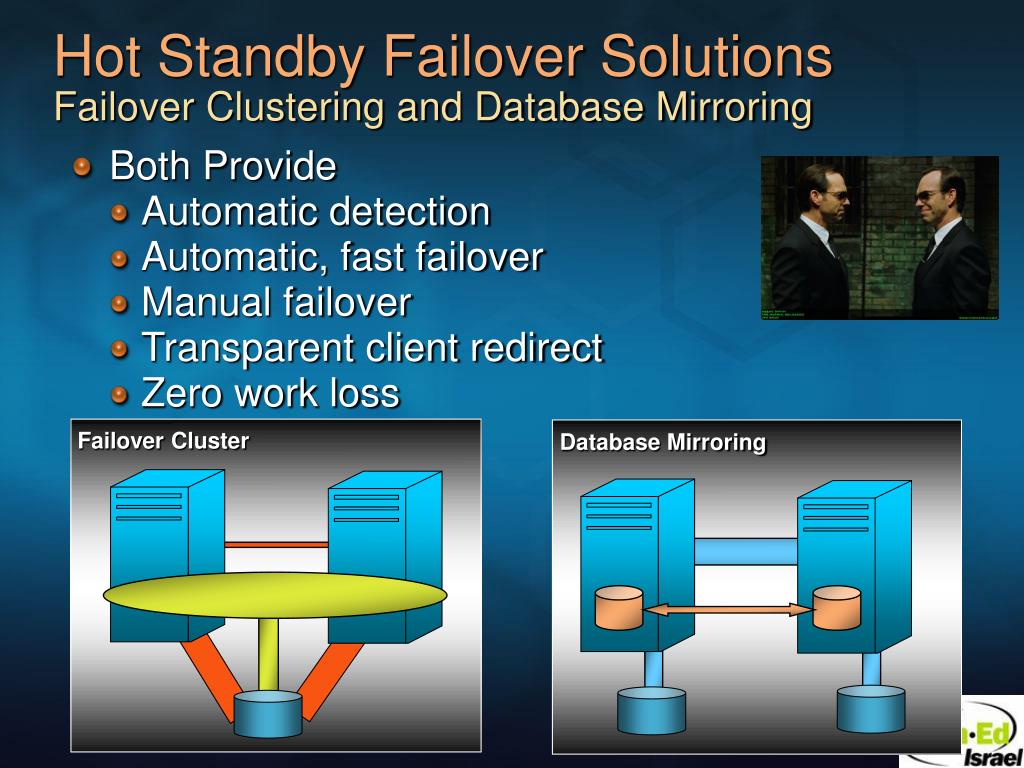 Failover Cluster Database Mirroring Hot Standby Failover SolutionsFailover Clustering and Database Mirroring • Both Provide • Automatic detection • Automatic, fast failover • Manual failover • Transparent client redirect • Zero work loss