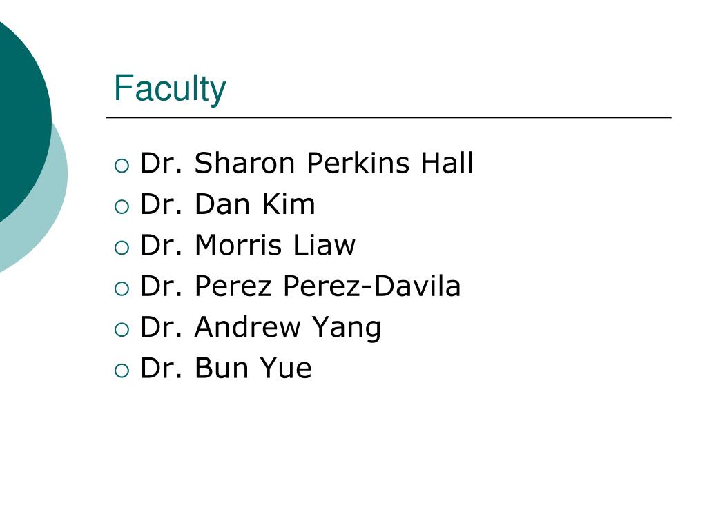Faculty • Dr. Sharon Perkins Hall • Dr. Dan Kim • Dr. Morris Liaw • Dr. Perez Perez-Davila • Dr. Andrew Yang • Dr. Bun Yue