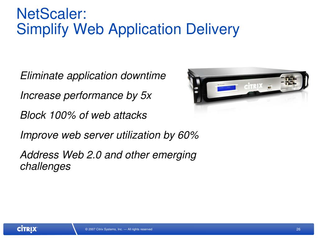 NetScaler: Simplify Web Application Delivery Eliminate application downtime Increase performance by 5x Block 100% of web attacks Improve web server utilization by 60% Address Web 2.0 and other emerging challenges