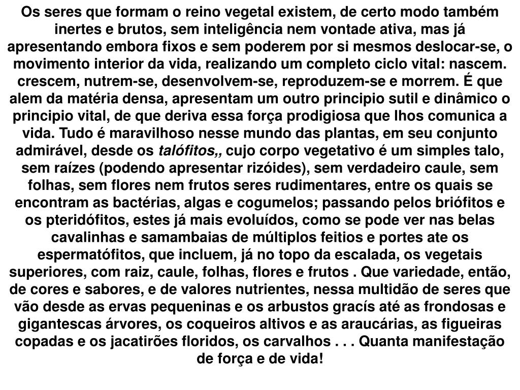 Os seres que formam o reino vegetal existem, de certo modo também inertes e brutos, sem inteligência nem vontade ativa, mas já apresentando embora fixos e sem poderem por si mesmos deslocar-se, o movimento interior da vida, realizando um completo ciclo vital: nascem. crescem, nutrem-se, desenvolvem-se, reproduzem-se e morrem. É que alem da matéria densa, apresentam um outro principio sutil e dinâmico o principio vital, de que deriva essa força prodigiosa que lhos comunica a vida. Tudo é maravilhoso nesse mundo das plantas, em seu conjunto admirável, desde os talófitos,, cujo corpo vegetativo é um simples talo, sem raízes (podendo apresentar rizóides), sem verdadeiro caule, sem folhas, sem flores nem frutos seres rudimentares, entre os quais se encontram as bactérias, algas e cogumelos; passando pelos briófitos e os pteridófitos, estes já mais evoluídos, como se pode ver nas belas cavalinhas e samambaias de múltiplos feitios e portes ate os espermatófitos, que incluem, já no topo da escalada, os vegetais superiores, com raiz, caule, folhas, flores e frutos . Que variedade, então, de cores e sabores, e de valores nutrientes, nessa multidão de seres que vão desde as ervas pequeninas e os arbustos gracís até as frondosas e gigantescas árvores, os coqueiros altivos e as araucárias, as figueiras copadas e os jacatirões floridos, os carvalhos . . . Quanta manifestação de força e de vida!