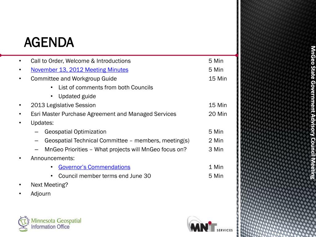 AGENDA • Call to Order, Welcome & Introductions 5 Min • November 13, 2012 Meeting Minutes 5 Min • Committee and Workgroup Guide 15 Min • List of comments from both Councils • Updated guide • 2013 Legislative Session 15 Min • Esri Master Purchase Agreement and Managed Services 20 Min • Updates: • Geospatial Optimization 5 Min • Geospatial Technical Committee – members, meeting(s) 2 Min • MnGeo Priorities – What projects will MnGeo focus on? 3 Min • Announcements: • Governor’s Commendations 1 Min • Council member terms end June 30 5 Min • Next Meeting? • Adjourn