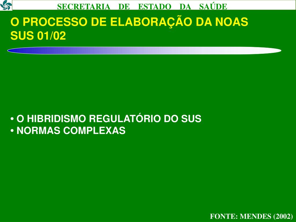 SECRETARIA DE ESTADO DA SAÚDE O PROCESSO DE ELABORAÇÃO DA NOAS SUS 01/02 • O HIBRIDISMO REGULATÓRIO DO SUS • NORMAS COMPLEXAS FONTE: MENDES (2002)