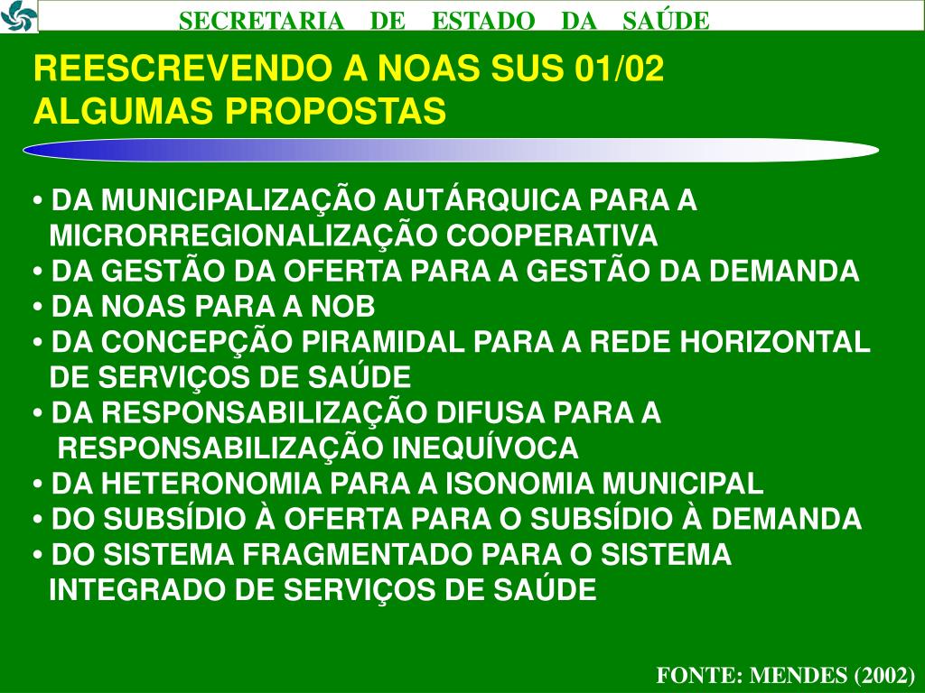 SECRETARIA DE ESTADO DA SAÚDE REESCREVENDO A NOAS SUS 01/02 ALGUMAS PROPOSTAS • DA MUNICIPALIZAÇÃO AUTÁRQUICA PARA A MICRORREGIONALIZAÇÃO COOPERATIVA • DA GESTÃO DA OFERTA PARA A GESTÃO DA DEMANDA • DA NOAS PARA A NOB • DA CONCEPÇÃO PIRAMIDAL PARA A REDE HORIZONTAL DE SERVIÇOS DE SAÚDE • DA RESPONSABILIZAÇÃO DIFUSA PARA A RESPONSABILIZAÇÃO INEQUÍVOCA • DA HETERONOMIA PARA A ISONOMIA MUNICIPAL • DO SUBSÍDIO À OFERTA PARA O SUBSÍDIO À DEMANDA • DO SISTEMA FRAGMENTADO PARA O SISTEMA INTEGRADO DE SERVIÇOS DE SAÚDE FONTE: MENDES (2002)
