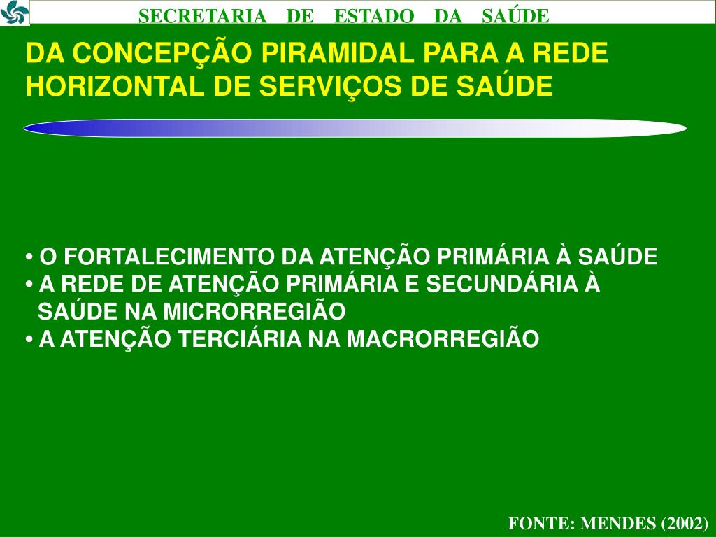 SECRETARIA DE ESTADO DA SAÚDE DA CONCEPÇÃO PIRAMIDAL PARA A REDE HORIZONTAL DE SERVIÇOS DE SAÚDE • O FORTALECIMENTO DA ATENÇÃO PRIMÁRIA À SAÚDE • A REDE DE ATENÇÃO PRIMÁRIA E SECUNDÁRIA À SAÚDE NA MICRORREGIÃO • A ATENÇÃO TERCIÁRIA NA MACRORREGIÃO FONTE: MENDES (2002)