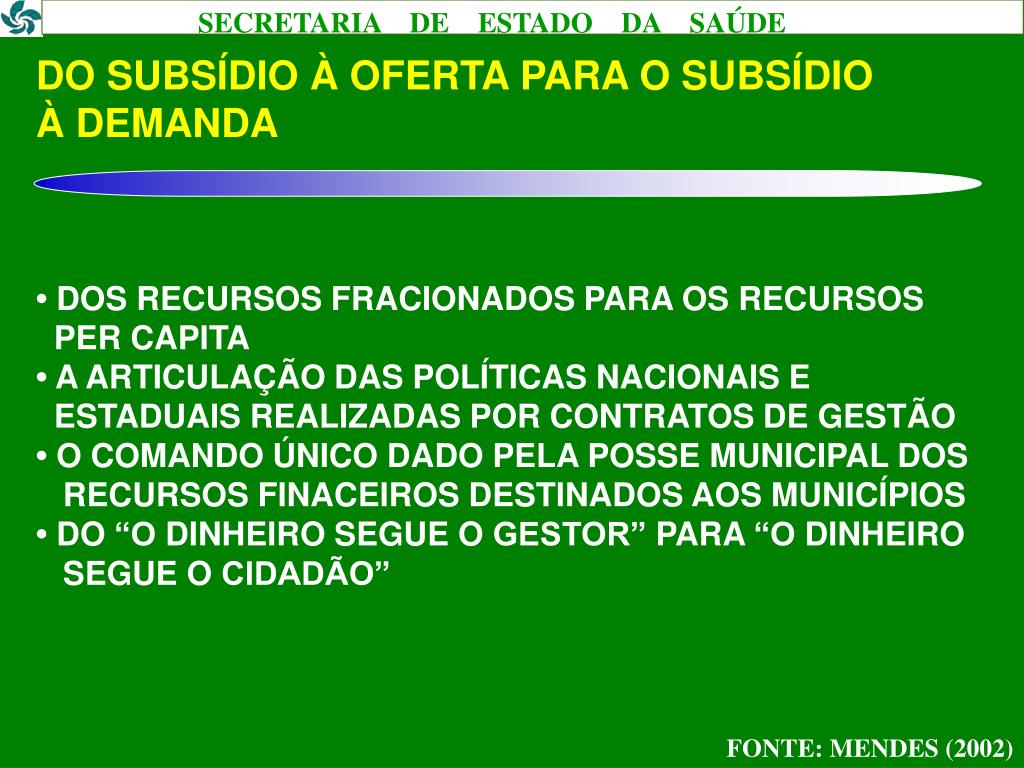 SECRETARIA DE ESTADO DA SAÚDE DO SUBSÍDIO À OFERTA PARA O SUBSÍDIO À DEMANDA • DOS RECURSOS FRACIONADOS PARA OS RECURSOS PER CAPITA • A ARTICULAÇÃO DAS POLÍTICAS NACIONAIS E ESTADUAIS REALIZADAS POR CONTRATOS DE GESTÃO • O COMANDO ÚNICO DADO PELA POSSE MUNICIPAL DOS RECURSOS FINACEIROS DESTINADOS AOS MUNICÍPIOS • DO “O DINHEIRO SEGUE O GESTOR” PARA “O DINHEIRO SEGUE O CIDADÃO” FONTE: MENDES (2002)