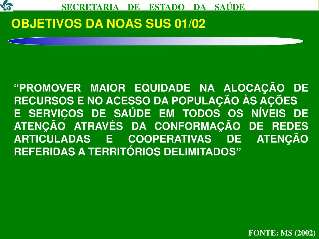 SECRETARIA DE ESTADO DA SAÚDE OBJETIVOS DA NOAS SUS 01/02 “PROMOVER MAIOR EQUIDADE NA ALOCAÇÃO DE RECURSOS E NO ACESSO DA POPULAÇÃO ÀS AÇÕES E SERVIÇOS DE SAÚDE EM TODOS OS NÍVEIS DE ATENÇÃO ATRAVÉS DA CONFORMAÇÃO DE REDES ARTICULADAS E COOPERATIVAS DE ATENÇÃO REFERIDAS A TERRITÓRIOS DELIMITADOS” FONTE: MS (2002)