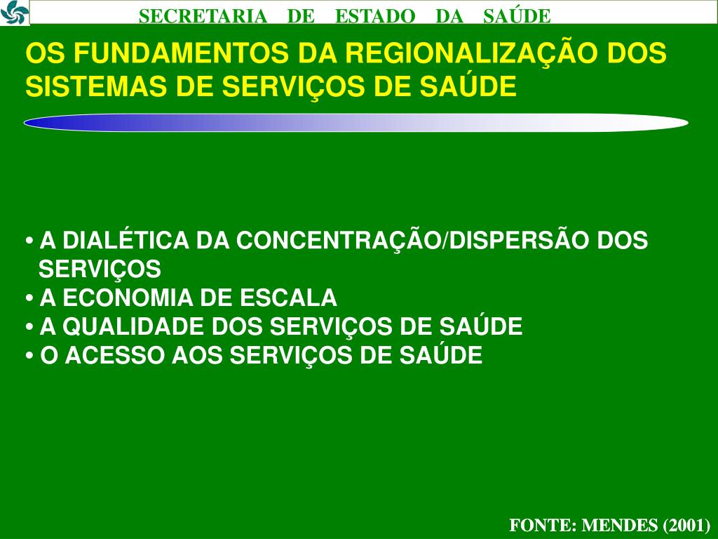 SECRETARIA DE ESTADO DA SAÚDE OS FUNDAMENTOS DA REGIONALIZAÇÃO DOS SISTEMAS DE SERVIÇOS DE SAÚDE • A DIALÉTICA DA CONCENTRAÇÃO/DISPERSÃO DOS SERVIÇOS • A ECONOMIA DE ESCALA • A QUALIDADE DOS SERVIÇOS DE SAÚDE • O ACESSO AOS SERVIÇOS DE SAÚDE FONTE: MENDES (2001) FONTE: MENDES (2001)