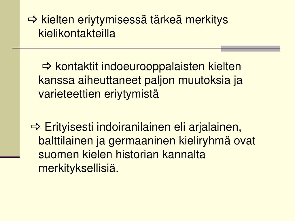 kielten eriytymisessä tärkeä merkitys kielikontakteilla kontaktit indoeurooppalaisten kielten kanssa aiheuttaneet paljon muutoksia ja varieteettien eriytymistä Erityisesti indoiranilainen eli arjalainen, balttilainen ja germaaninen kieliryhmä ovat suomen kielen historian kannalta merkityksellisiä.