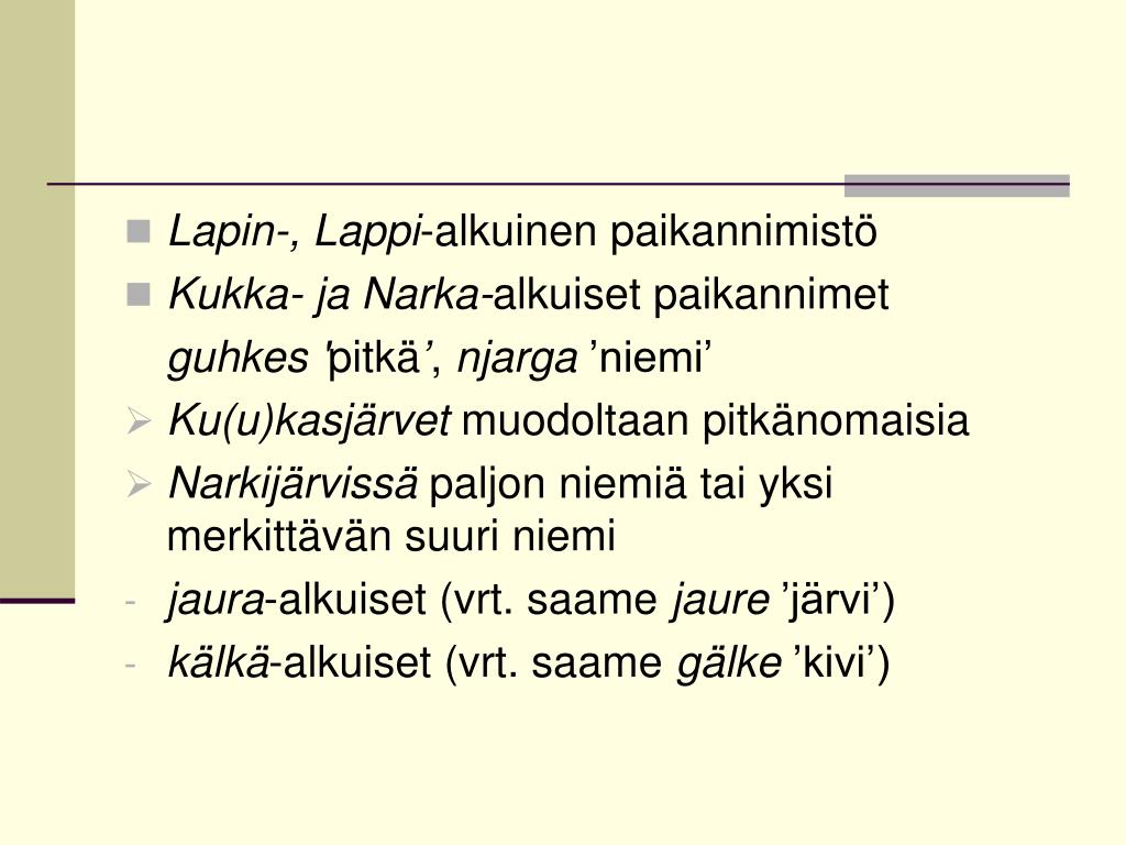 Lapin-, Lappi-alkuinen paikannimistö • Kukka- ja Narka-alkuiset paikannimet guhkes 'pitkä’, njarga ’niemi’ • Ku(u)kasjärvet muodoltaan pitkänomaisia • Narkijärvissä paljon niemiä tai yksi merkittävän suuri niemi • jaura-alkuiset (vrt. saame jaure ’järvi’) • kälkä-alkuiset (vrt. saame gälke ’kivi’)