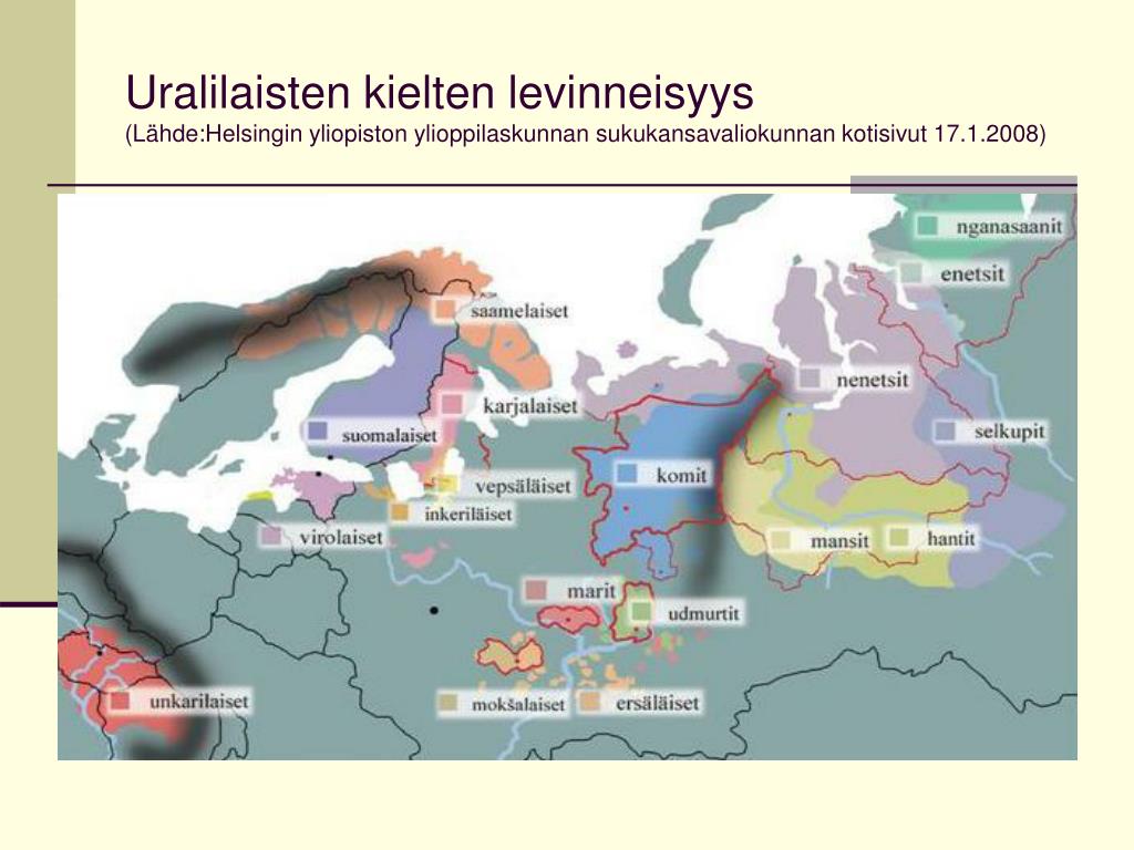 Uralilaisten kielten levinneisyys(Lähde:Helsingin yliopiston ylioppilaskunnan sukukansavaliokunnan kotisivut 17.1.2008)