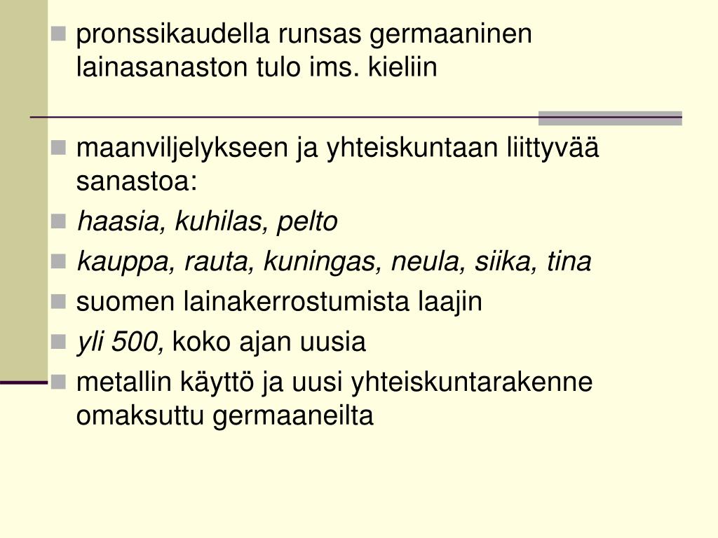 pronssikaudella runsas germaaninen lainasanaston tulo ims. kieliin • maanviljelykseen ja yhteiskuntaan liittyvää sanastoa: • haasia, kuhilas, pelto • kauppa, rauta, kuningas, neula, siika,tina • suomen lainakerrostumista laajin • yli 500, koko ajan uusia • metallin käyttö ja uusi yhteiskuntarakenne omaksuttu germaaneilta
