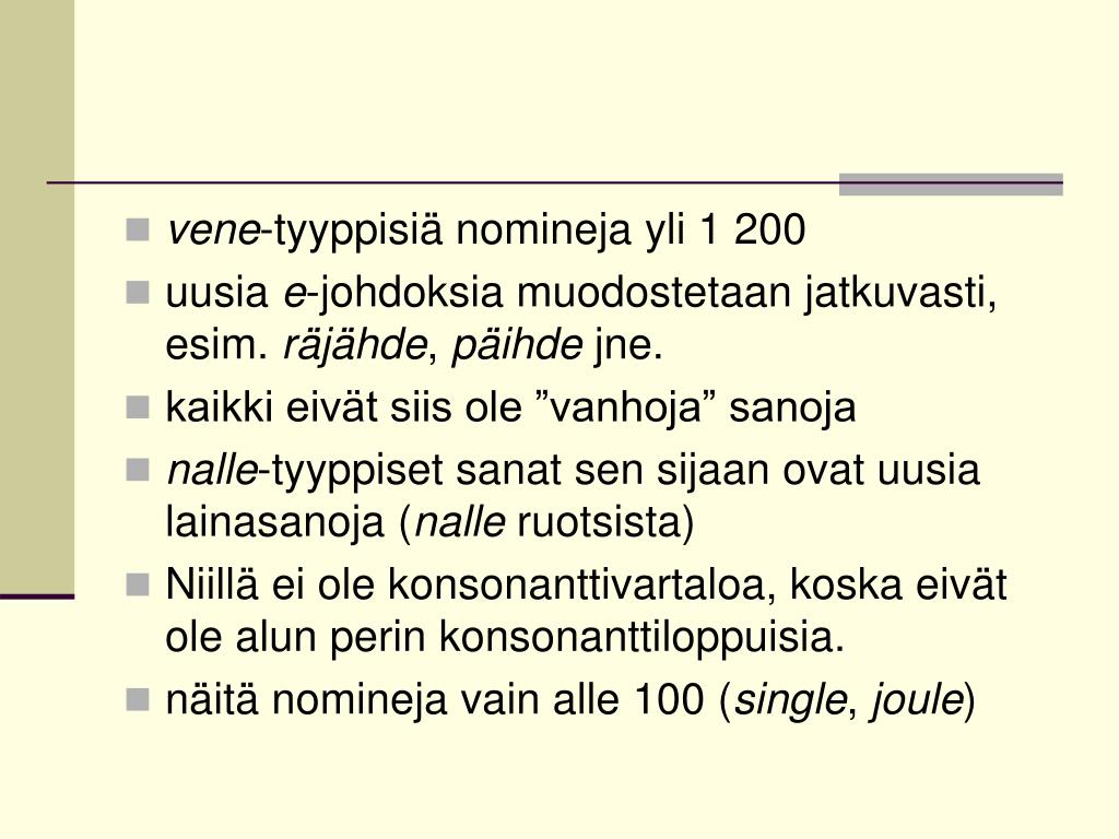 vene-tyyppisiä nomineja yli 1 200 • uusia e-johdoksia muodostetaan jatkuvasti, esim. räjähde, päihde jne. • kaikki eivät siis ole ”vanhoja” sanoja • nalle-tyyppiset sanat sen sijaan ovat uusia lainasanoja (nalle ruotsista) • Niillä ei ole konsonanttivartaloa, koska eivät ole alun perin konsonanttiloppuisia. • näitä nomineja vain alle 100 (single, joule)