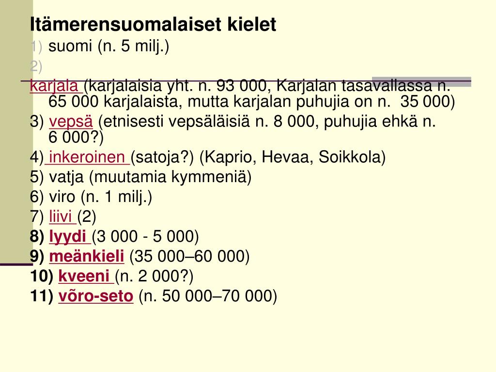 Itämerensuomalaiset kielet • suomi (n. 5 milj.) karjala (karjalaisia yht. n. 93 000, Karjalan tasavallassa n. 65 000 karjalaista, mutta karjalan puhujia on n. 35 000) 3) vepsä (etnisesti vepsäläisiä n. 8 000, puhujia ehkä n. 6 000?) 4)inkeroinen (satoja?) (Kaprio, Hevaa, Soikkola) 5) vatja (muutamia kymmeniä) 6) viro (n. 1 milj.) 7) liivi (2) 8) lyydi (3 000 - 5 000) 9) meänkieli(35 000–60 000) 10) kveeni (n. 2 000?) 11) võro-seto(n. 50 000–70 000)
