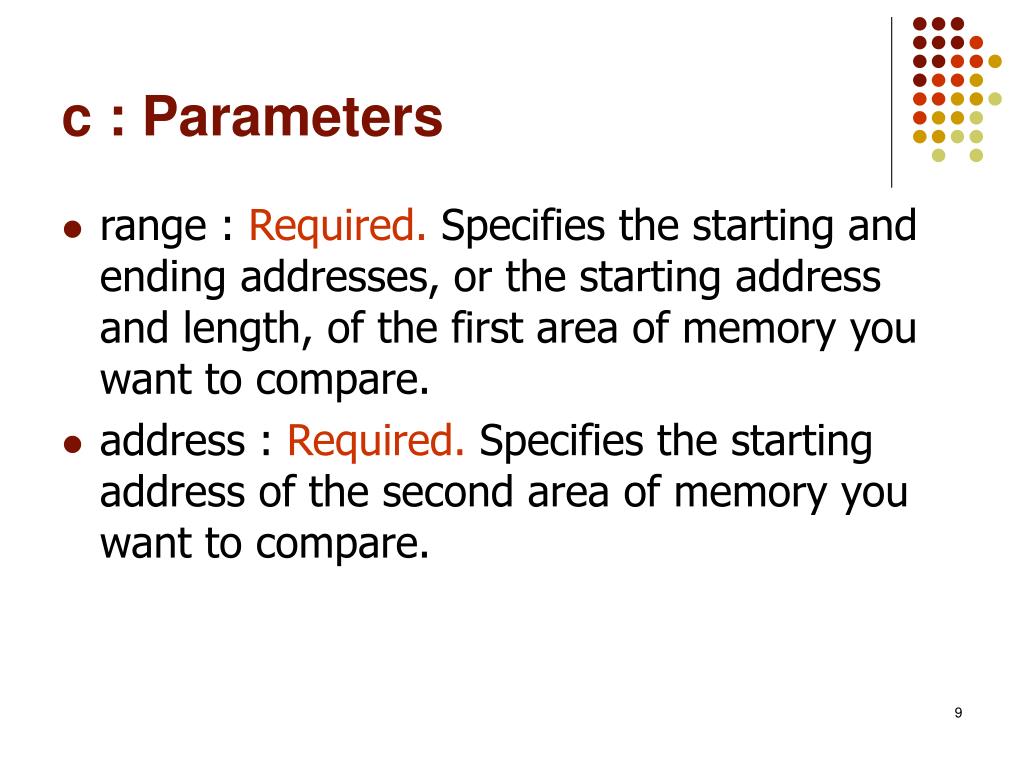 c : Parameters • range : Required. Specifies the starting and ending addresses, or the starting address and length, of the first area of memory you want to compare. • address : Required. Specifies the starting address of the second area of memory you want to compare.