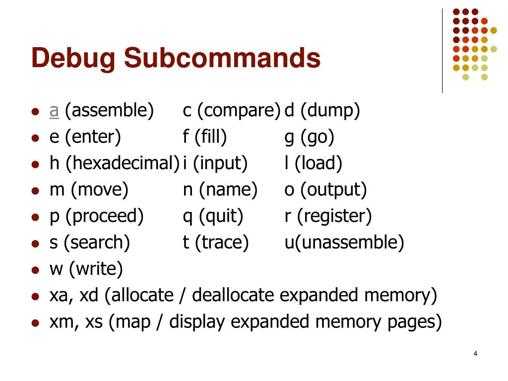 Debug Subcommands • a(assemble) c (compare) d (dump) • e (enter) f (fill) g (go) • h (hexadecimal) i (input) l (load) • m (move) n (name) o (output) • p (proceed) q (quit) r (register) • s (search) t (trace) u(unassemble) • w (write) • xa, xd (allocate / deallocate expanded memory) • xm, xs (map / display expanded memory pages)