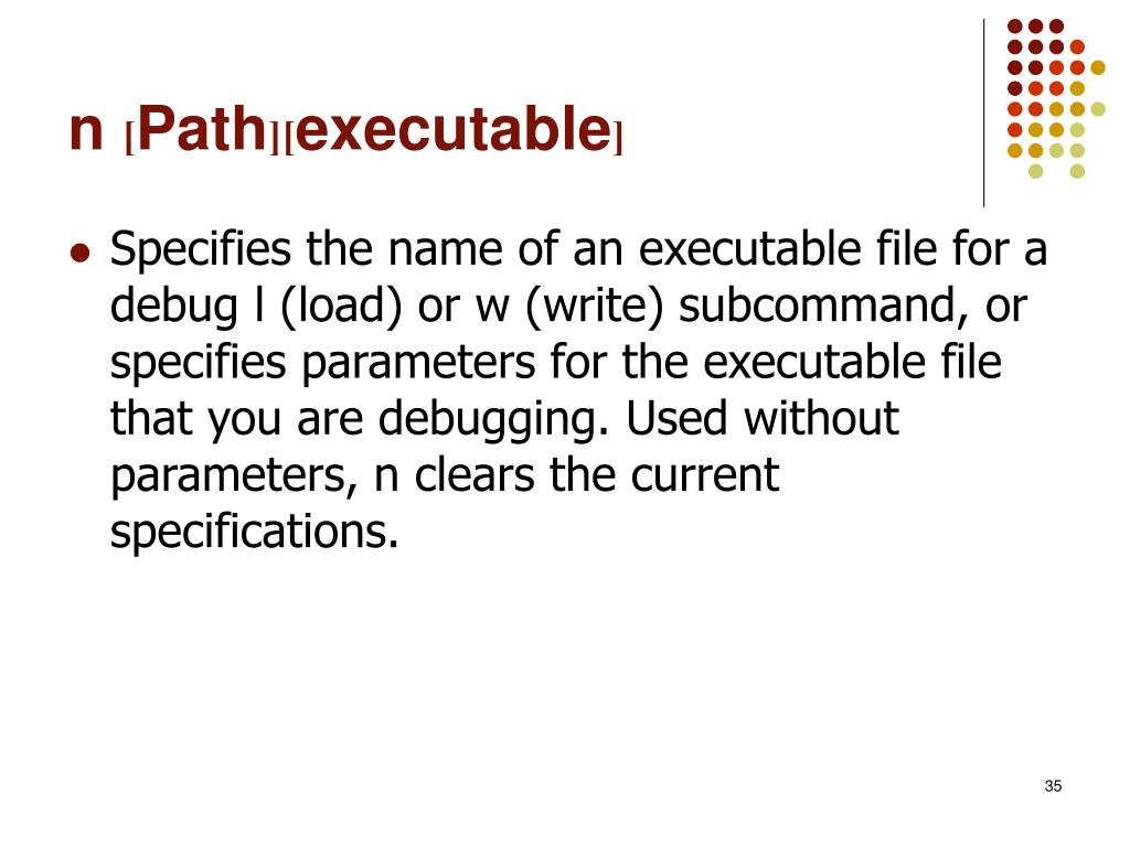 n [Path][executable] • Specifies the name of an executable file for a debug l (load) or w (write) subcommand, or specifies parameters for the executable file that you are debugging. Used without parameters, n clears the current specifications.