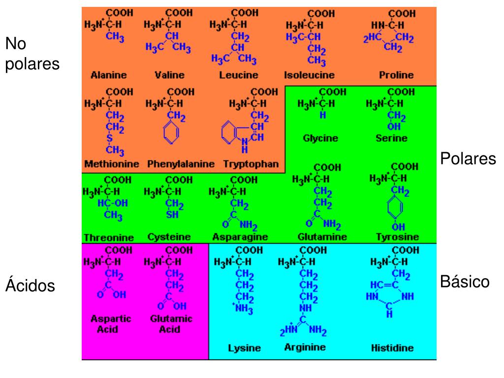 Aminoácidos. Es cualquier molecular orgánica que posee por lo menos un grupo carboxilo (un acido orgánico) y un grupo amino (una base orgánica). Forman a las proteínas. Existen 20 aminoácidos estándar que forman las proteínas de la mayoría de los organismos.