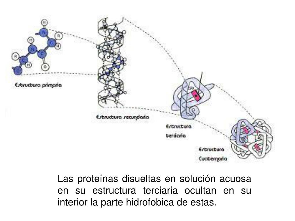 Las proteínas disueltas en solución acuosa en su estructura terciaria ocultan en su interior la parte hidrofobica de estas.