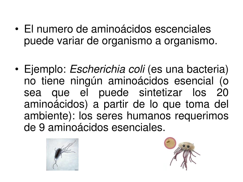El numero de aminoácidos escenciales puede variar de organismo a organismo. • Ejemplo: Escherichia coli (es una bacteria) no tiene ningún aminoácidos esencial (o sea que el puede sintetizar los 20 aminoácidos) a partir de lo que toma del ambiente): los seres humanos requerimos de 9 aminoácidos esenciales.