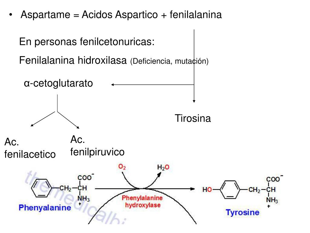 En personas fenilcetonuricas: Fenilalanina hidroxilasa (Deficiencia, mutación) • Aspartame = Acidos Aspartico + fenilalanina α-cetoglutarato Tirosina Ac. fenilpiruvico Ac. fenilacetico