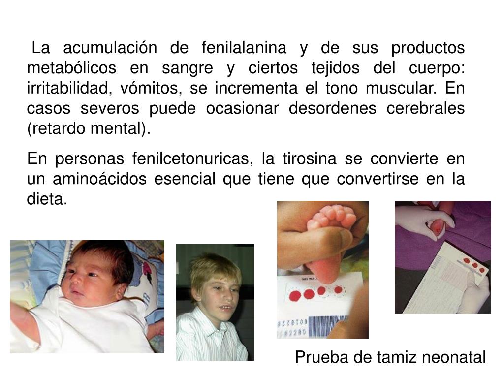 La acumulación de fenilalanina y de sus productos metabólicos en sangre y ciertos tejidos del cuerpo: irritabilidad, vómitos, se incrementa el tono muscular. En casos severos puede ocasionar desordenes cerebrales (retardo mental). En personas fenilcetonuricas, la tirosina se convierte en un aminoácidos esencial que tiene que convertirse en la dieta. Prueba de tamiz neonatal