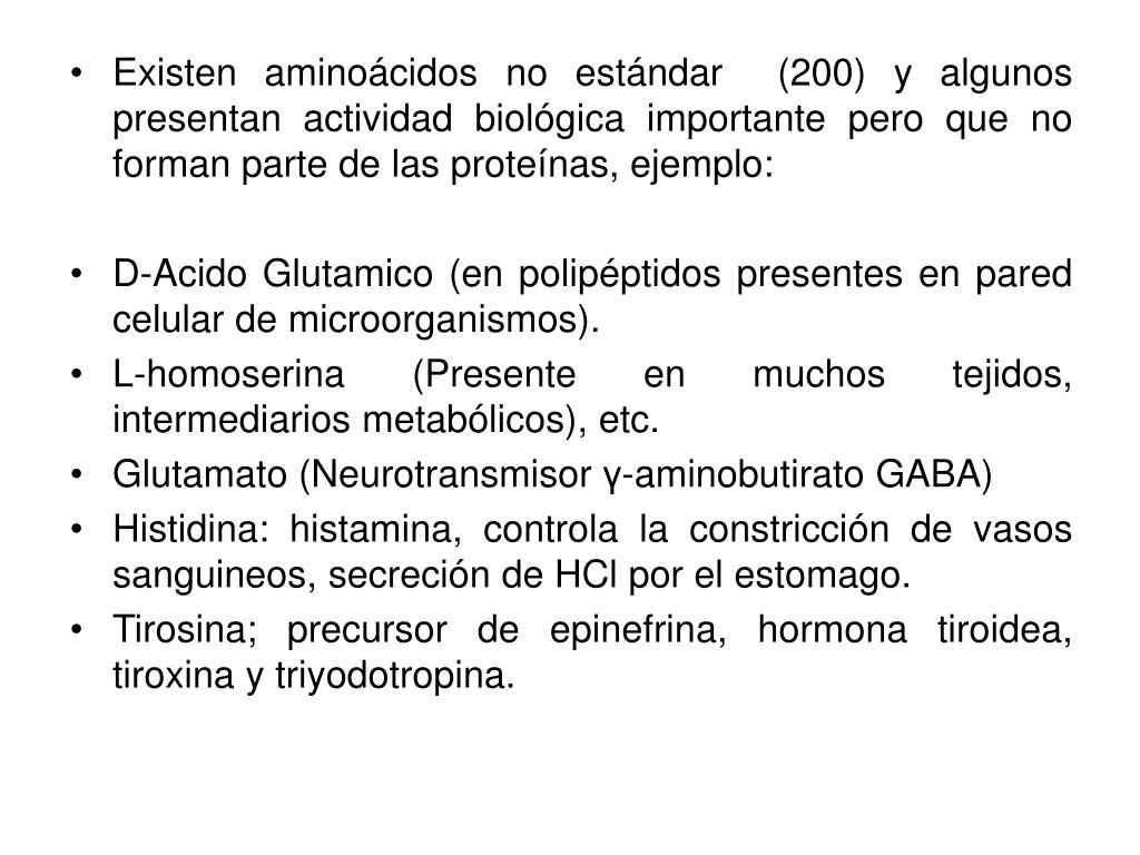 Existen aminoácidos no estándar (200) y algunos presentan actividad biológica importante pero que no forman parte de las proteínas, ejemplo: • D-Acido Glutamico (en polipéptidos presentes en pared celular de microorganismos). • L-homoserina (Presente en muchos tejidos, intermediarios metabólicos), etc. • Glutamato (Neurotransmisor γ-aminobutirato GABA) • Histidina: histamina, controla la constricción de vasos sanguineos, secreción de HCl por el estomago. • Tirosina; precursor de epinefrina, hormona tiroidea, tiroxina y triyodotropina.