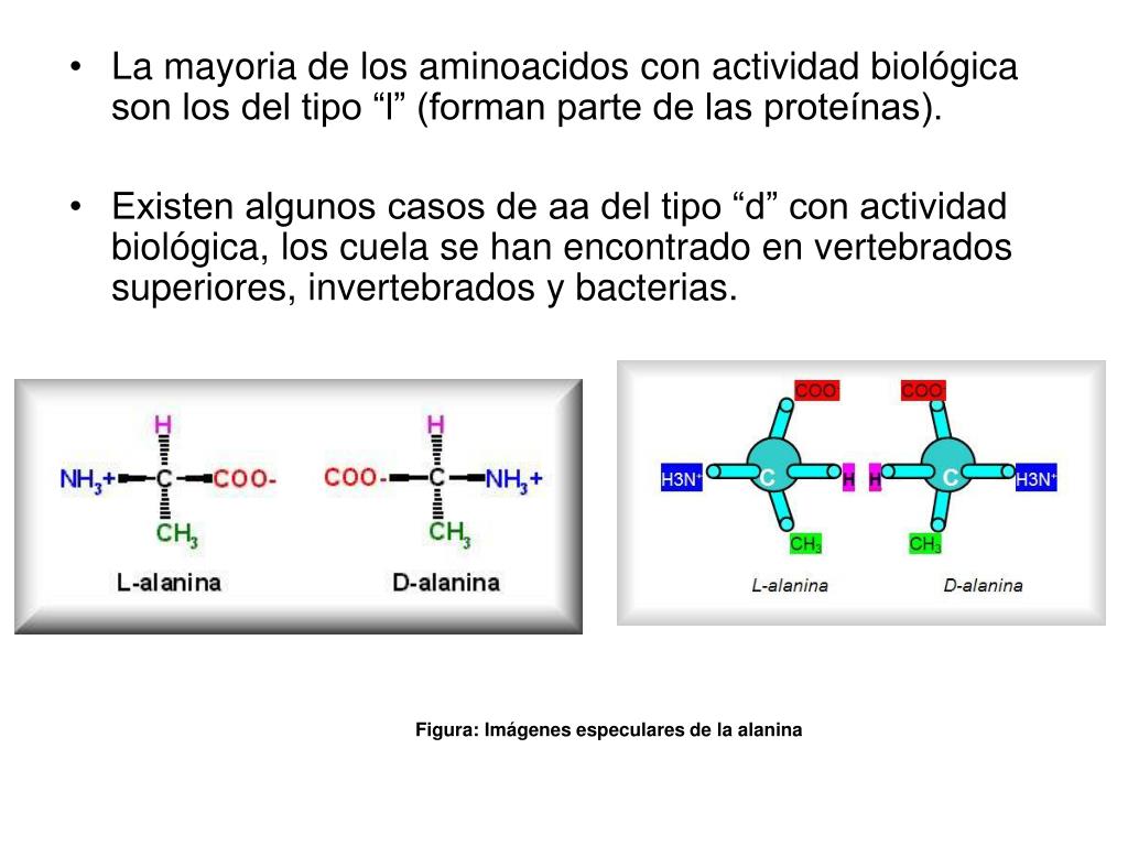 La mayoria de los aminoacidos con actividad biológica son los del tipo “l” (forman parte de las proteínas). • Existen algunos casos de aa del tipo “d” con actividad biológica, los cuela se han encontrado en vertebrados superiores, invertebrados y bacterias. Figura: Imágenes especulares de la alanina