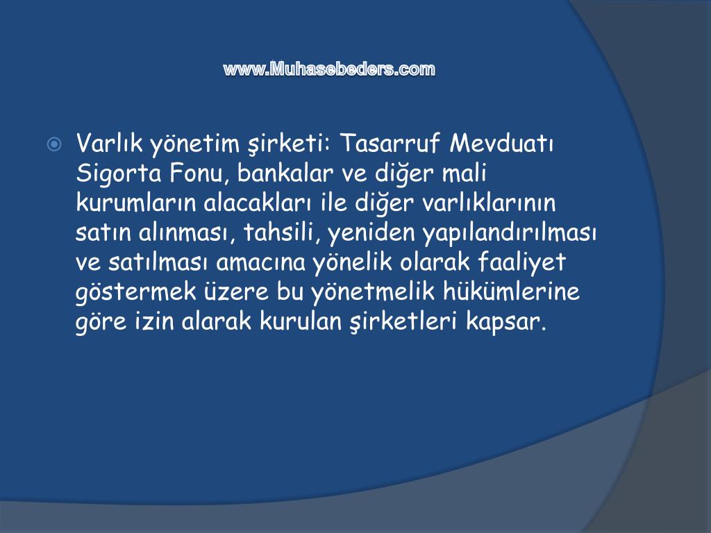 www.Muhasebeders.com • Varlık yönetim şirketi: Tasarruf Mevduatı Sigorta Fonu, bankalar ve diğer mali kurumların alacakları ile diğer varlıklarının satın alınması, tahsili, yeniden yapılandırılması ve satılması amacına yönelik olarak faaliyet göstermek üzere bu yönetmelik hükümlerine göre izin alarak kurulan şirketleri kapsar.