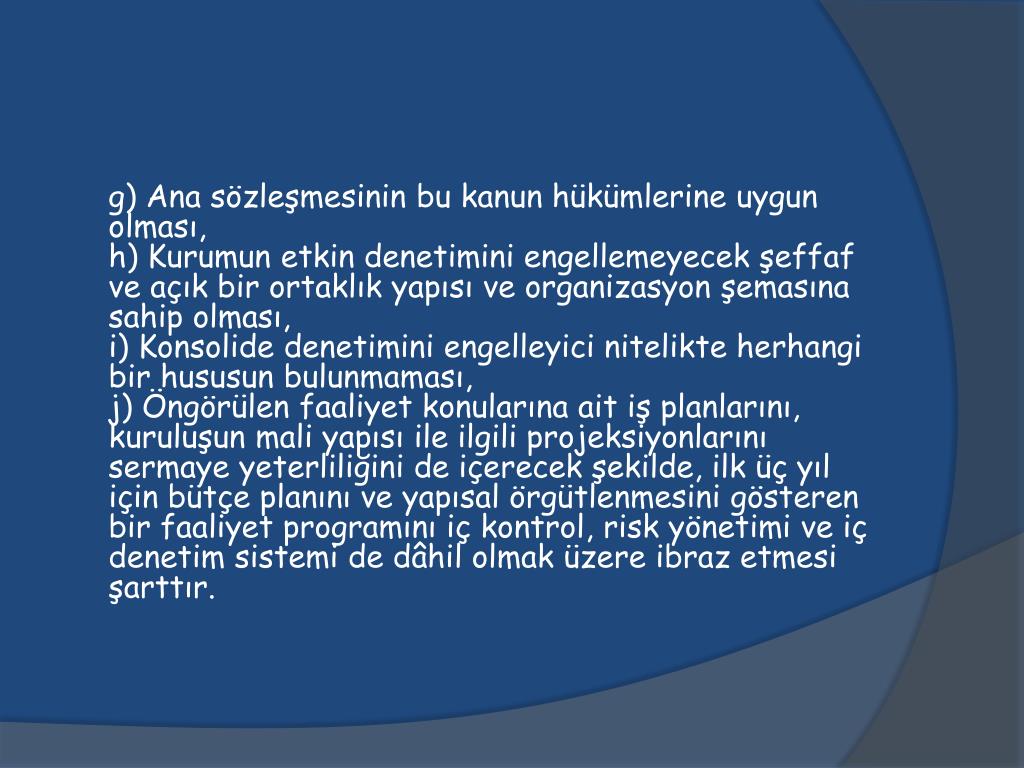 g) Ana sözleşmesinin bu kanun hükümlerine uygun olması,h) Kurumun etkin denetimini engellemeyecek şeffaf ve açık bir ortaklık yapısı ve organizasyon şemasına sahip olması,i) Konsolide denetimini engelleyici nitelikte herhangi bir hususun bulunmaması,j) Öngörülen faaliyet konularına ait iş planlarını, kuruluşun mali yapısı ile ilgili projeksiyonlarını sermaye yeterliliğini de içerecek şekilde, ilk üç yıl için bütçe planını ve yapısal örgütlenmesini gösteren bir faaliyet programını iç kontrol, risk yönetimi ve iç denetim sistemi de dâhil olmak üzere ibraz etmesi şarttır.
