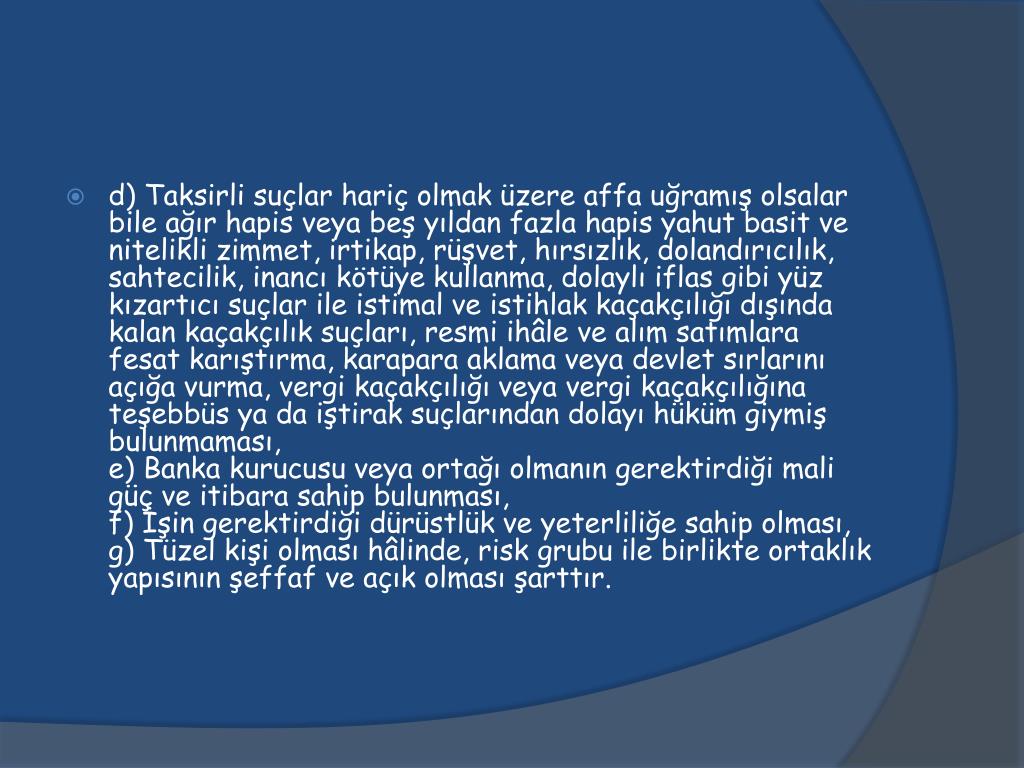 d) Taksirli suçlar hariç olmak üzere affa uğramış olsalar bile ağır hapis veya beş yıldan fazla hapis yahut basit ve nitelikli zimmet, irtikap, rüşvet, hırsızlık, dolandırıcılık, sahtecilik, inancı kötüye kullanma, dolaylı iflas gibi yüz kızartıcı suçlar ile istimal ve istihlak kaçakçılığı dışında kalan kaçakçılık suçları, resmi ihâle ve alım satımlara fesat karıştırma, karapara aklama veya devlet sırlarını açığa vurma, vergi kaçakçılığı veya vergi kaçakçılığına teşebbüs ya da iştirak suçlarından dolayı hüküm giymiş bulunmaması,e) Banka kurucusu veya ortağı olmanın gerektirdiği mali güç ve itibara sahip bulunması,f) İşin gerektirdiği dürüstlük ve yeterliliğe sahip olması,g) Tüzel kişi olması hâlinde, risk grubu ile birlikte ortaklık yapısının şeffaf ve açık olması şarttır.