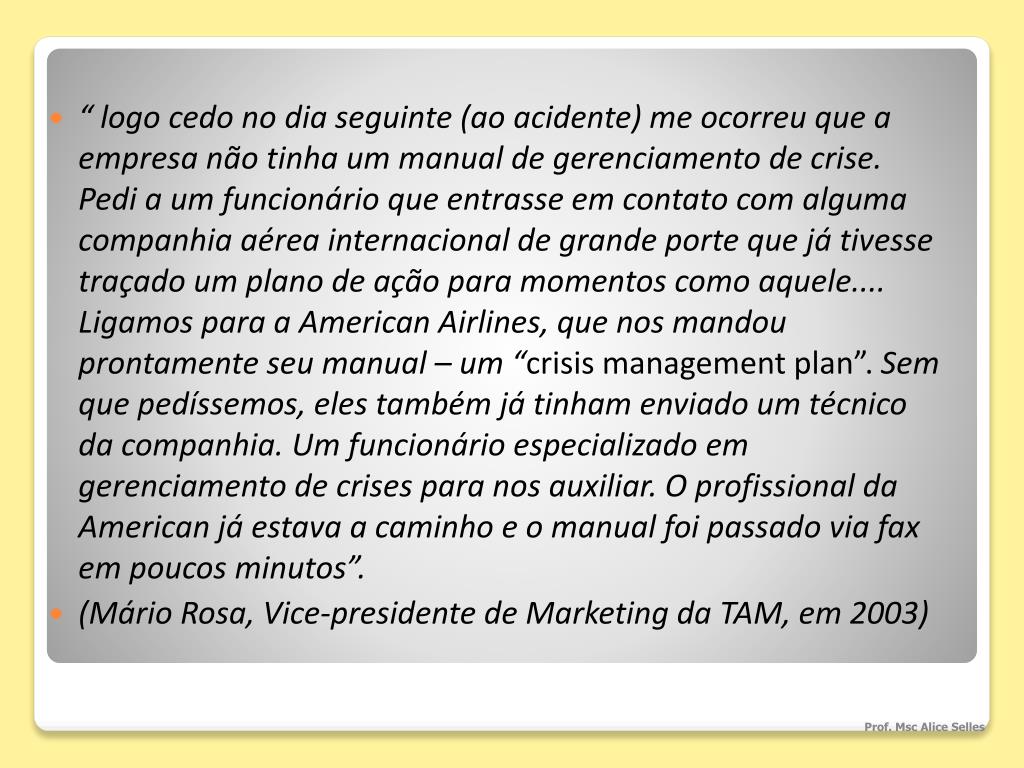 “ logo cedo no dia seguinte (ao acidente) me ocorreu que a empresa não tinha um manual de gerenciamento de crise. Pedi a um funcionário que entrasse em contato com alguma companhia aérea internacional de grande porte que já tivesse traçado um plano de ação para momentos como aquele.... Ligamos para a AmericanAirlines, que nos mandou prontamente seu manual – um “crisis management plan”. Sem que pedíssemos, eles também já tinham enviado um técnico da companhia. Um funcionário especializado em gerenciamento de crises para nos auxiliar. O profissional da American já estava a caminho e o manual foi passado via fax em poucos minutos”. (Mário Rosa, Vice-presidente de Marketing da TAM, em 2003) Prof. MscAlice Selles
