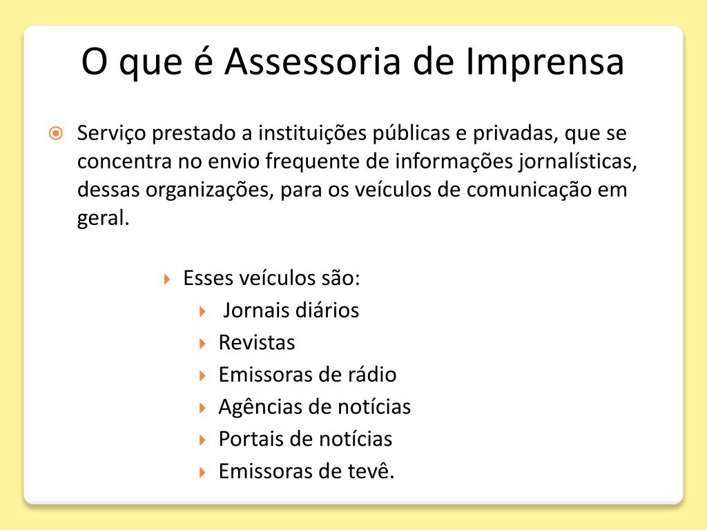 O que é Assessoria de Imprensa • Serviço prestado a instituições públicas e privadas, que se concentra no envio frequente de informações jornalísticas, dessas organizações, para os veículos de comunicação em geral. • Esses veículos são: • Jornais diários • Revistas • Emissoras de rádio • Agências de notícias • Portais de notícias • Emissoras de tevê.