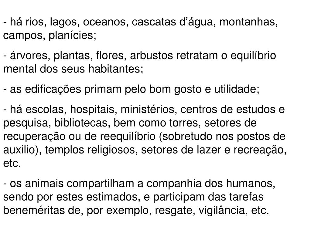 - há rios, lagos, oceanos, cascatas d’água, montanhas, campos, planícies; - árvores, plantas, flores, arbustos retratam o equilíbrio mental dos seus habitantes; - as edificações primam pelo bom gosto e utilidade; - há escolas, hospitais, ministérios, centros de estudos e pesquisa, bibliotecas, bem como torres, setores de recuperação ou de reequilíbrio (sobretudo nos postos de auxilio), templos religiosos, setores de lazer e recreação, etc. - os animais compartilham a companhia dos humanos, sendo por estes estimados, e participam das tarefas beneméritas de, por exemplo, resgate, vigilância, etc.