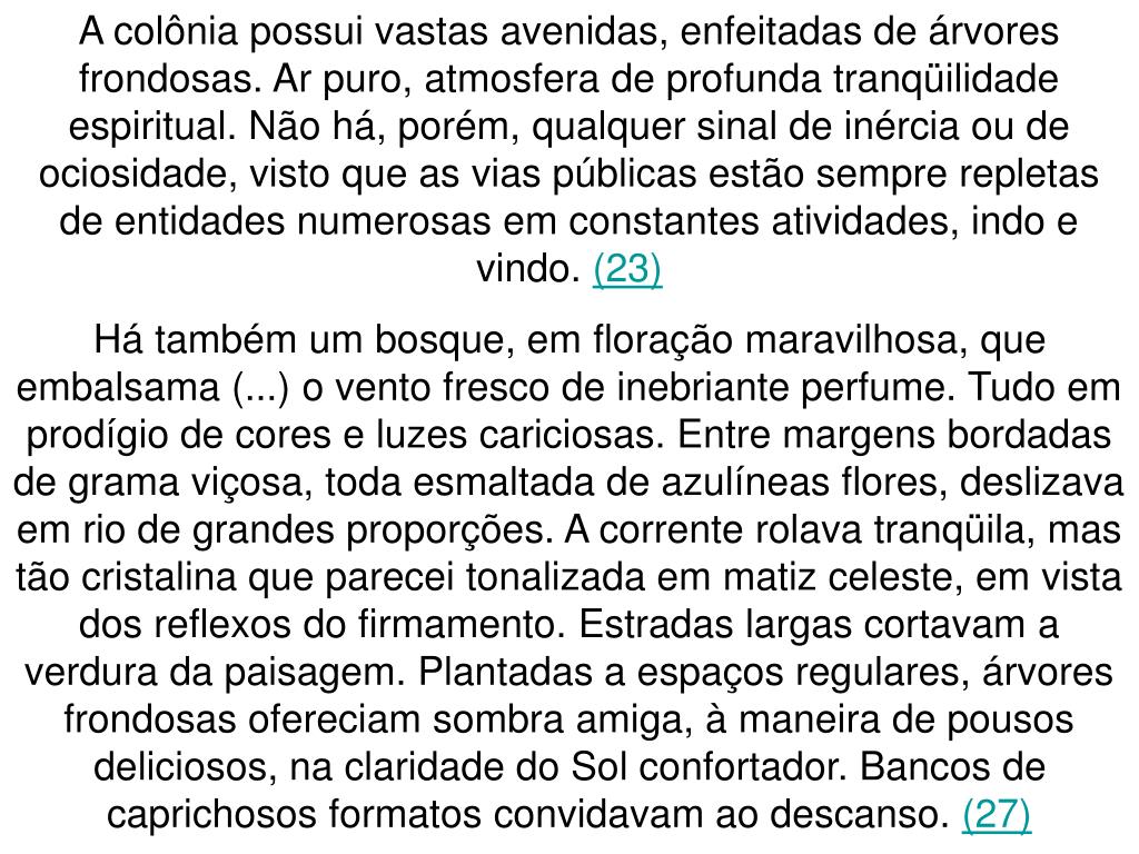 A colônia possui vastas avenidas, enfeitadas de árvores frondosas. Ar puro, atmosfera de profunda tranqüilidade espiritual. Não há, porém, qualquer sinal de inércia ou de ociosidade, visto que as vias públicas estão sempre repletas de entidades numerosas em constantes atividades, indo e vindo. (23) Há também um bosque, em floração maravilhosa, que embalsama (...) o vento fresco de inebriante perfume. Tudo em prodígio de cores e luzes cariciosas. Entre margens bordadas de grama viçosa, toda esmaltada de azulíneas flores, deslizava em rio de grandes proporções. A corrente rolava tranqüila, mas tão cristalina que parecei tonalizada em matiz celeste, em vista dos reflexos do firmamento. Estradas largas cortavam a verdura da paisagem. Plantadas a espaços regulares, árvores frondosas ofereciam sombra amiga, à maneira de pousos deliciosos, na claridade do Sol confortador. Bancos de caprichosos formatos convidavam ao descanso. (27)