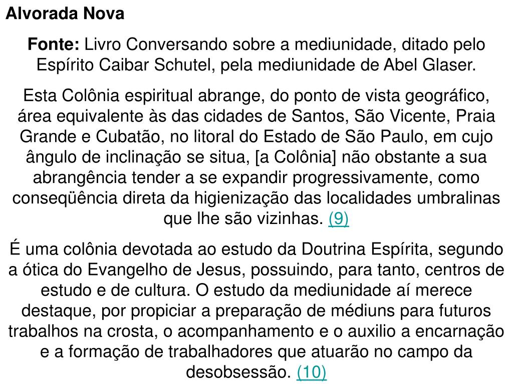 Alvorada Nova Fonte: Livro Conversando sobre a mediunidade, ditado pelo Espírito Caibar Schutel, pela mediunidade de Abel Glaser. Esta Colônia espiritual abrange, do ponto de vista geográfico, área equivalente às das cidades de Santos, São Vicente, Praia Grande e Cubatão, no litoral do Estado de São Paulo, em cujo ângulo de inclinação se situa, [a Colônia] não obstante a sua abrangência tender a se expandir progressivamente, como conseqüência direta da higienização das localidades umbralinas que lhe são vizinhas. (9) É uma colônia devotada ao estudo da Doutrina Espírita, segundo a ótica do Evangelho de Jesus, possuindo, para tanto, centros de estudo e de cultura. O estudo da mediunidade aí merece destaque, por propiciar a preparação de médiuns para futuros trabalhos na crosta, o acompanhamento e o auxilio a encarnação e a formação de trabalhadores que atuarão no campo da desobsessão. (10)