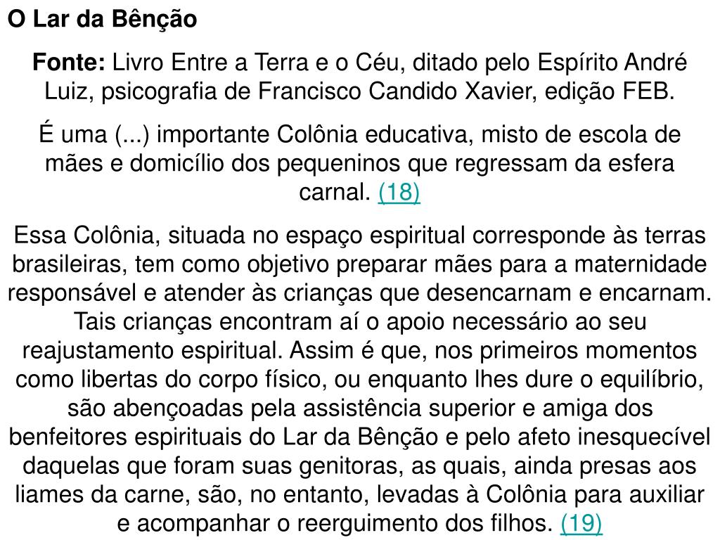 O Lar da Bênção Fonte: Livro Entre a Terra e o Céu, ditado pelo Espírito André Luiz, psicografia de Francisco Candido Xavier, edição FEB. É uma (...) importante Colônia educativa, misto de escola de mães e domicílio dos pequeninos que regressam da esfera carnal. (18) Essa Colônia, situada no espaço espiritual corresponde às terras brasileiras, tem como objetivo preparar mães para a maternidade responsável e atender às crianças que desencarnam e encarnam. Tais crianças encontram aí o apoio necessário ao seu reajustamento espiritual. Assim é que, nos primeiros momentos como libertas do corpo físico, ou enquanto lhes dure o equilíbrio, são abençoadas pela assistência superior e amiga dos benfeitores espirituais do Lar da Bênção e pelo afeto inesquecível daquelas que foram suas genitoras, as quais, ainda presas aos liames da carne, são, no entanto, levadas à Colônia para auxiliar e acompanhar o reerguimento dos filhos. (19)