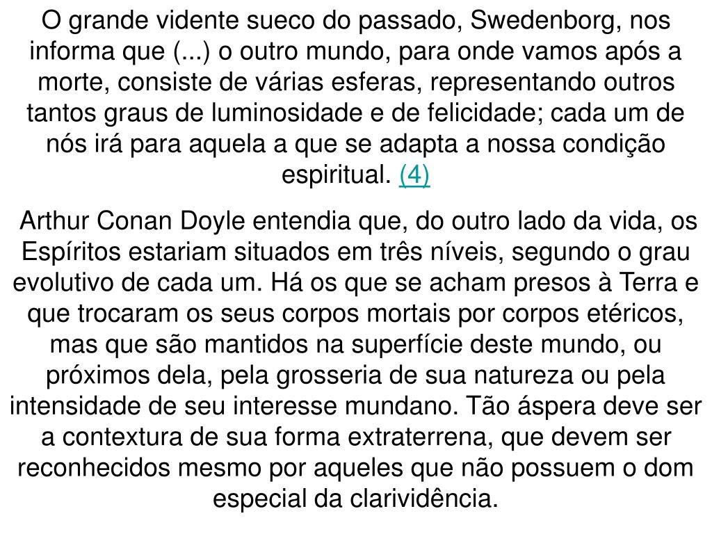 O grande vidente sueco do passado, Swedenborg, nos informa que (...) o outro mundo, para onde vamos após a morte, consiste de várias esferas, representando outros tantos graus de luminosidade e de felicidade; cada um de nós irá para aquela a que se adapta a nossa condição espiritual. (4) Arthur Conan Doyle entendia que, do outro lado da vida, os Espíritos estariam situados em três níveis, segundo o grau evolutivo de cada um. Há os que se acham presos à Terra e que trocaram os seus corpos mortais por corpos etéricos, mas que são mantidos na superfície deste mundo, ou próximos dela, pela grosseria de sua natureza ou pela intensidade de seu interesse mundano. Tão áspera deve ser a contextura de sua forma extraterrena, que devem ser reconhecidos mesmo por aqueles que não possuem o dom especial da clarividência.