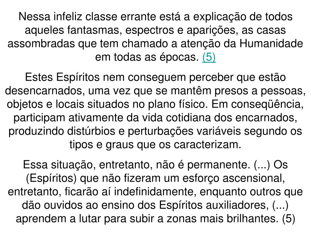 Nessa infeliz classe errante está a explicação de todos aqueles fantasmas, espectros e aparições, as casas assombradas que tem chamado a atenção da Humanidade em todas as épocas. (5) Estes Espíritos nem conseguem perceber que estão desencarnados, uma vez que se mantêm presos a pessoas, objetos e locais situados no plano físico. Em conseqüência, participam ativamente da vida cotidiana dos encarnados, produzindo distúrbios e perturbações variáveis segundo os tipos e graus que os caracterizam. Essa situação, entretanto, não é permanente. (...) Os (Espíritos) que não fizeram um esforço ascensional, entretanto, ficarão aí indefinidamente, enquanto outros que dão ouvidos ao ensino dos Espíritos auxiliadores, (...) aprendem a lutar para subir a zonas mais brilhantes. (5)