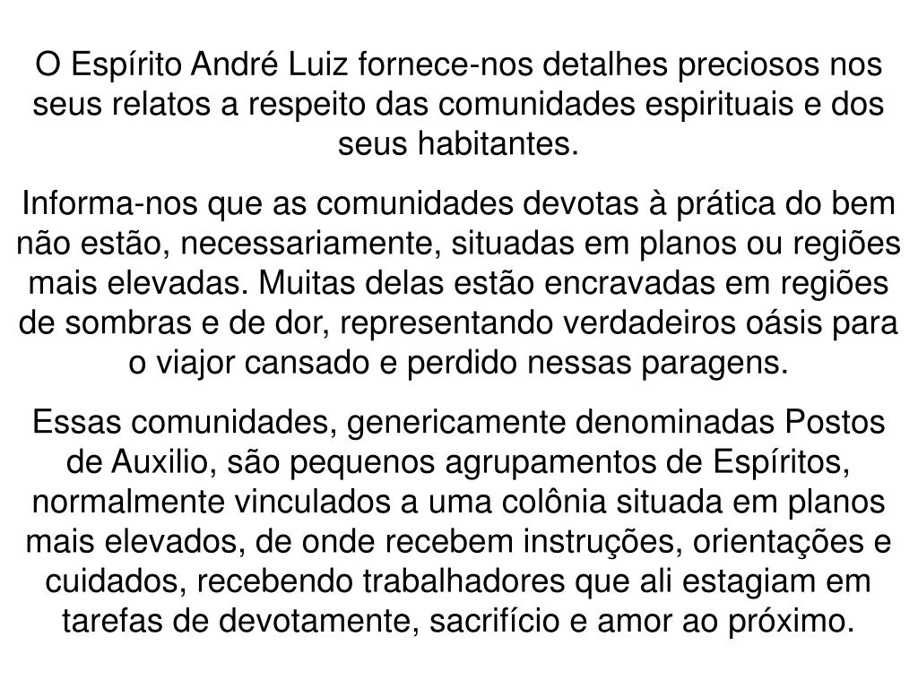 O Espírito André Luiz fornece-nos detalhes preciosos nos seus relatos a respeito das comunidades espirituais e dos seus habitantes. Informa-nos que as comunidades devotas à prática do bem não estão, necessariamente, situadas em planos ou regiões mais elevadas. Muitas delas estão encravadas em regiões de sombras e de dor, representando verdadeiros oásis para o viajor cansado e perdido nessas paragens. Essas comunidades, genericamente denominadas Postos de Auxilio, são pequenos agrupamentos de Espíritos, normalmente vinculados a uma colônia situada em planos mais elevados, de onde recebem instruções, orientações e cuidados, recebendo trabalhadores que ali estagiam em tarefas de devotamente, sacrifício e amor ao próximo.